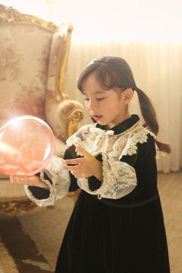 𝑨𝒅𝒆𝒍𝒆 đặc biệt hút mắt bởi chất liệu nhung mềm đen tuyền sang trọng với độ óng ánh huyền ảo cùng dáng váy xòe nhẹ, tay áo dài chuông nhẹ về phía cổ tay và cổ áo sen. Ở gấu váy, tay áo hay cổ áo đều được phối thêm viền ren lượn sóng ánh gold để tăng độ nổi bật cho sản phẩm. 𝑨𝒅𝒆𝒍𝒆 cũng có điểm nhấn đắt giá là vạt ren đáp ngực thêu hoa tinh tế. 𝑨𝒅𝒆𝒍𝒆 không có phần viền bèo ruffle cầu kì như 𝑱𝒐𝒄𝒂𝒔𝒕𝒂 nhưng lại tinh tế nổi bật nhờ gam màu đen huyền bí làm tôn nổi bật các chi tiết ren thêu ánh gold. Nếu mẹ và bé muốn kiếm tìm một thiết kế nổi bật cho các sự kiện, các dịp đặc biệt, hay chụp hình phong cách cổ điển châu Âu thì chắc chắn 𝑨𝒅𝒆𝒍𝒆 là sự lựa chọn hoàn hảo.