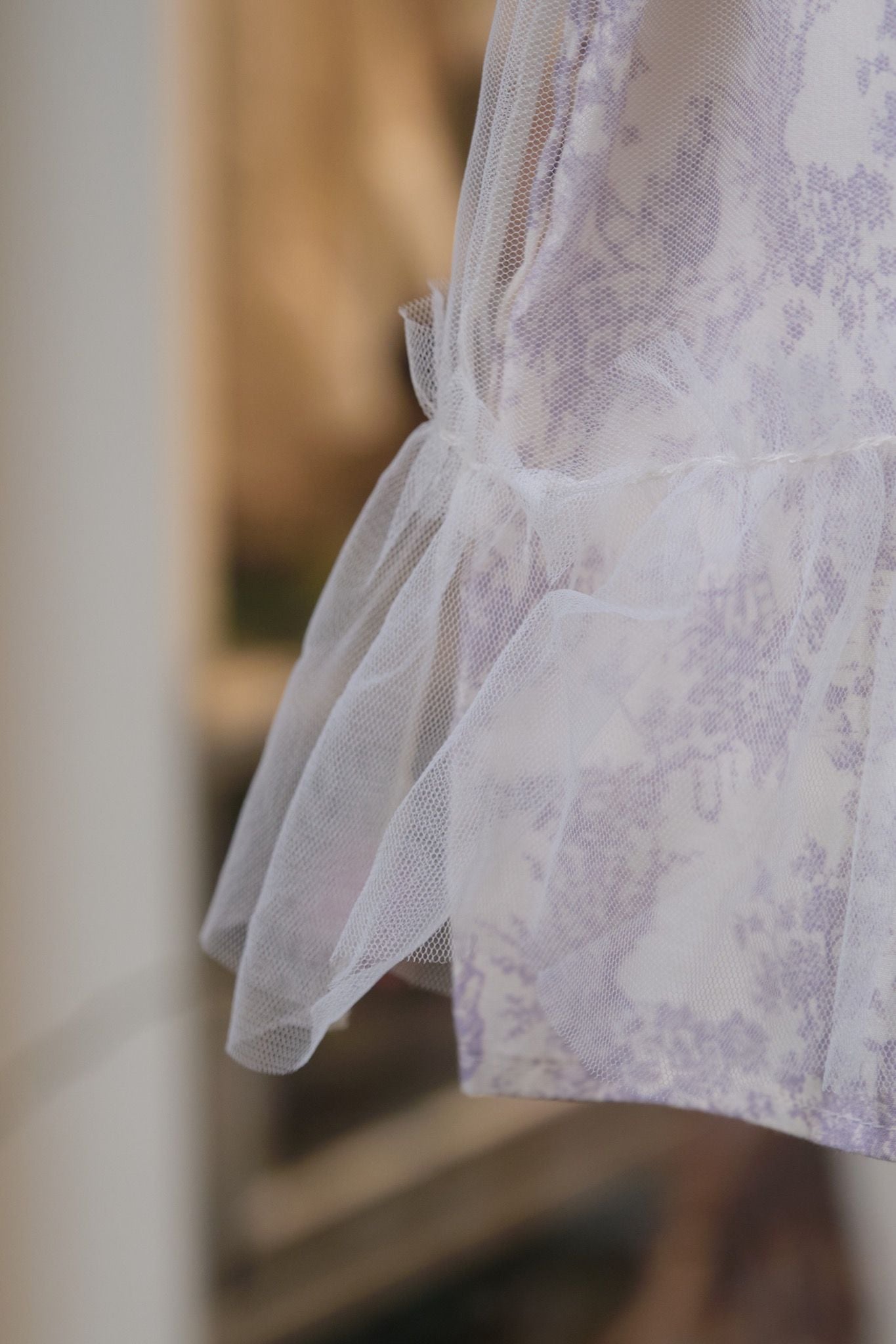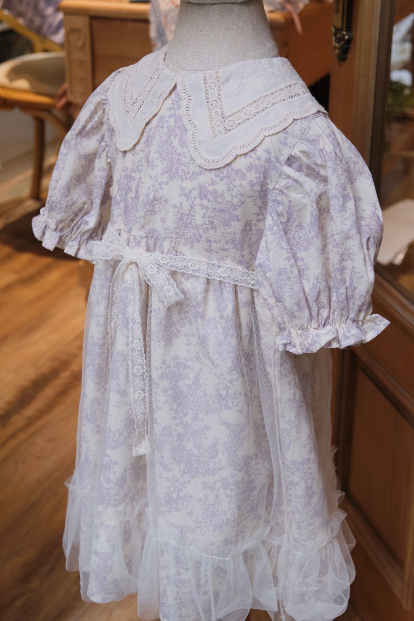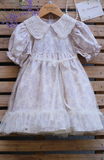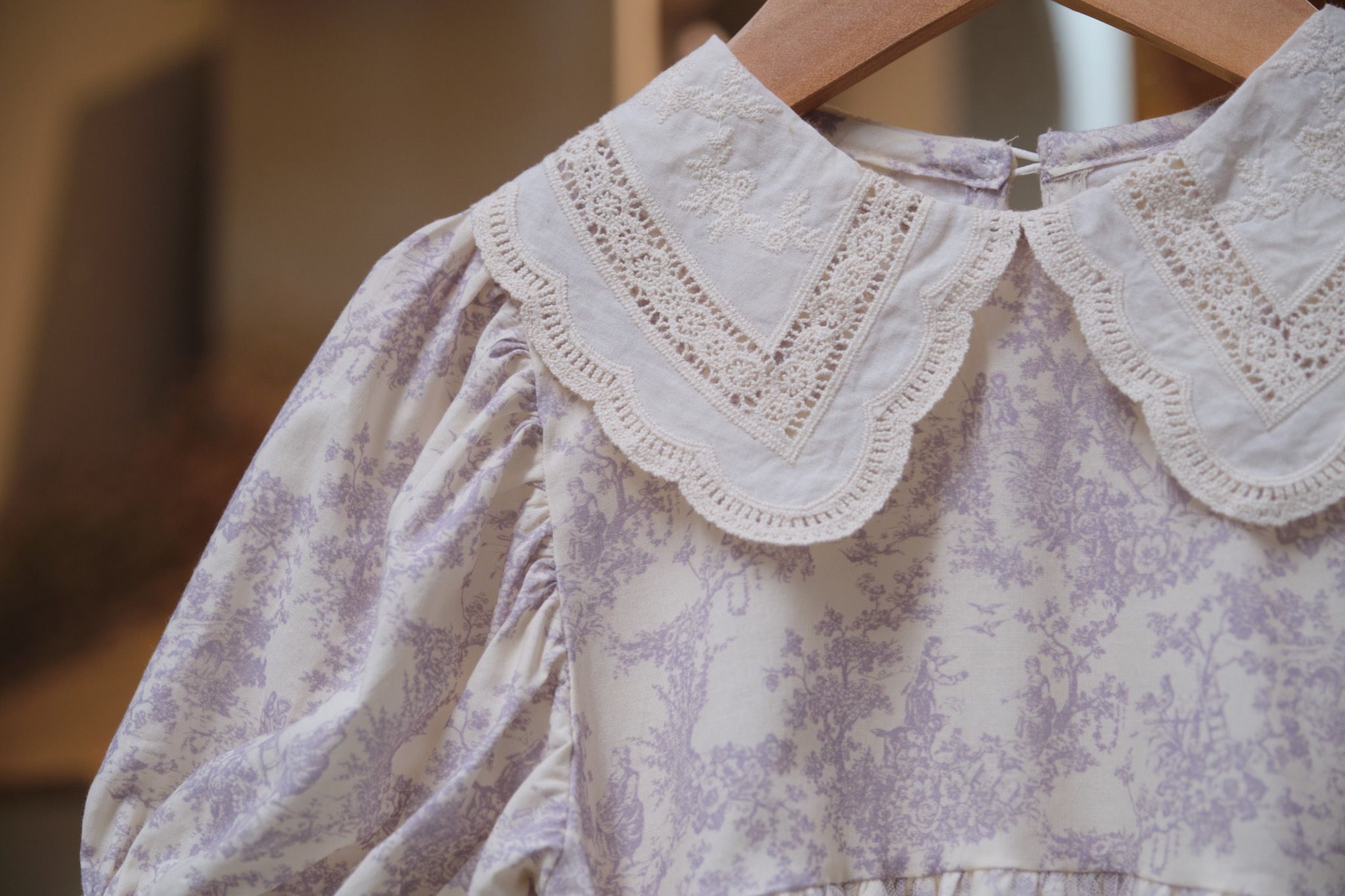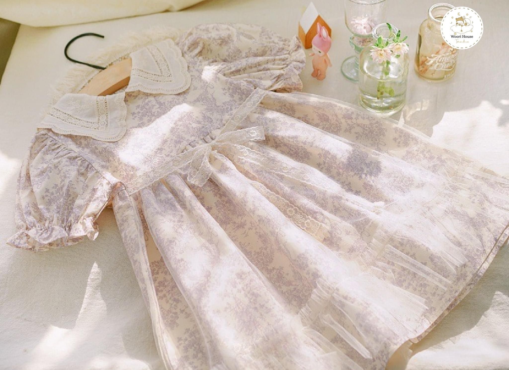 Romantic Lilac là thiết kế váy xòe xếp li điệu đà kết hợp với lớp voan bồng bên ngoài tạo độ bồng bềnh như váy công chúa, cổ áo ren thêu hoa nhí nổi dáng Peter Pan đầy tinh tế, cùng điểm nhấn đặc biệt là những khóm hoa nhí tone tím mộng mơ trên nền cotton tự nhiên màu trắng ngà. Mẹ đi đâu để tìm được item vừa xinh xắn vừa pha lẫn nét lãng mạn như Romantic Lilac phải không ạ